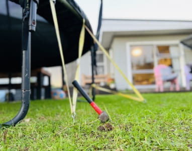Secure your trampoline to the ground with rope, stacks or tent pegs to keep it from blowing away.